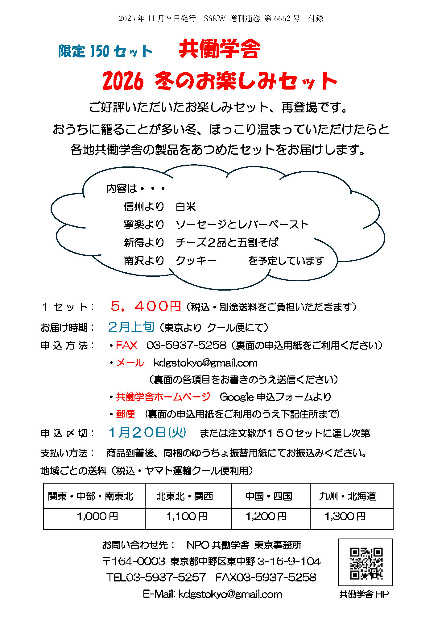 昨年も大好評で売り切れてしまった特別セットです。 各地の共働学舎から、冬の暮らしを豊かにする詰め合わせをご用意しました。 送料*別途申し受けます *ヤマト運輸クール宅急便でのお届けになります 地域送料 関東・中部・南東北1,000円 北東北・関西1,100円 中国・四国1,200円 九州・北海道1,300円 注文フォーム 【ご依頼主情報】 お名前 必須 メールアドレス 必須 ※迷惑メール防止設定をしている場合は、あらかじめ解除お願い致します。 電話番号 必須 郵便番号 必須 ご住所 必須 ご請求先 必須 ご請求先様宛に、送料を含めたご請求書とお振込用紙をお送りします。 ご依頼主お届け先 【ご注文・お届け先情報】 注文数 12345678910 お届け先 ご依頼主様その他 お名前 *ご依頼主様と異なる場合のみ入力 電話番号 *ご依頼主様と異なる場合のみ入力 郵便番号 *ご依頼主様と異なる場合のみ入力 ご住所 *ご依頼主様と異なる場合のみ入力 お届け時間指定 なし午前中14〜16時16〜18時18〜20時19〜21時 【その他】 その他のご要望がありましたらご入力ください。 「送信」ボタンを押した後、2秒ほどお待ちください。 下記にメッセージが表示されます。 チラシ・FAX用ご注文書 ダウンロード 関連記事 NEWお知らせ立屋真木 2025年12月23日【信州共働学舎】ご好評につき、新米は完売いたしました NEWお知らせ全体会報 2025年12月12日共働学舎会報 2025年クリスマス号 NEWお知らせ全体真木 2025年11月16日12月5~7日「10年後の今、真木を語る」写真/上映/トーク