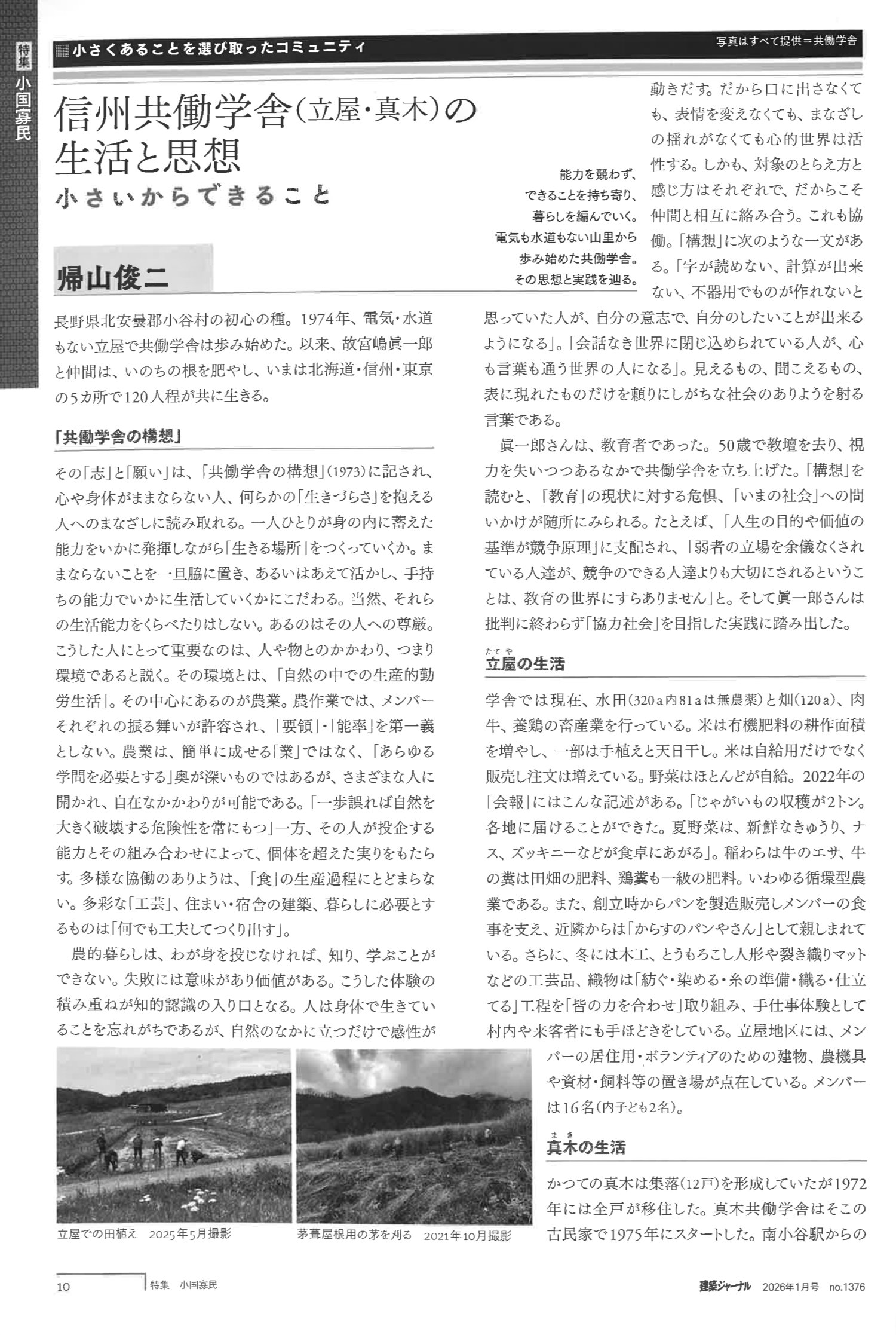 月間『建築ジャーナル』1月号に紹介の記事全文を、 こちらからお読みいただけます。 関連記事 NEWお知らせ全体会報 2026年3月10日共働学舎会報 2026年春季号 お知らせ立屋真木 2025年12月23日【信州共働学舎】ご好評につき、新米は完売いたしました お知らせ全体 2025年12月12日【お申込み締切】今年も「冬のお楽しみセット」をご用意しました